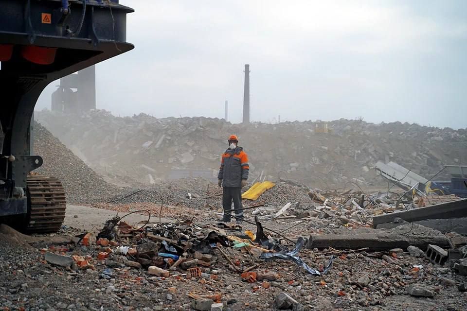 Территория завода "Электросталь" в Мариуполе — место, где снесенные хрущевки и сталинки получают вторую жизнь. На полигоне перерабатывают десятки тысяч тонн строительных отходов.