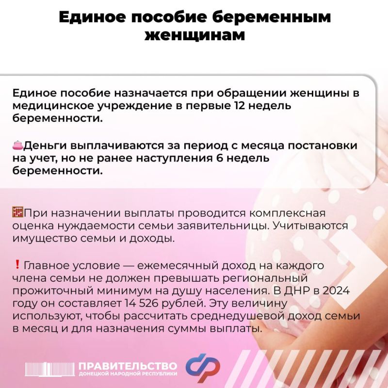 Единое пособие беременным женщинам Источник: Правительство ДНРГосводрыбхоз ДНР информирует о текущей работе Специалистами Госводрыбхоза ДНР, Федерального Государственного бюджетного водохозяйственного
