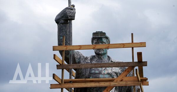 Мариуполь, 25 апр — ДАН. Восстановительные работы начались на памятнике Сталевару, который установлен при въезде в Мариуполь. Фотокорреспондент ДАН сегодня осмотрел ход ремонта.