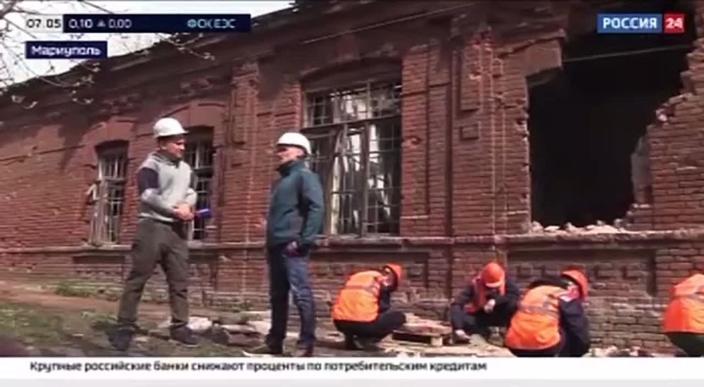 Глава администрации Мариуполя показал телеканалу Россия 24, как строительные бригады ремонтируют пострадавшие в ходе бое