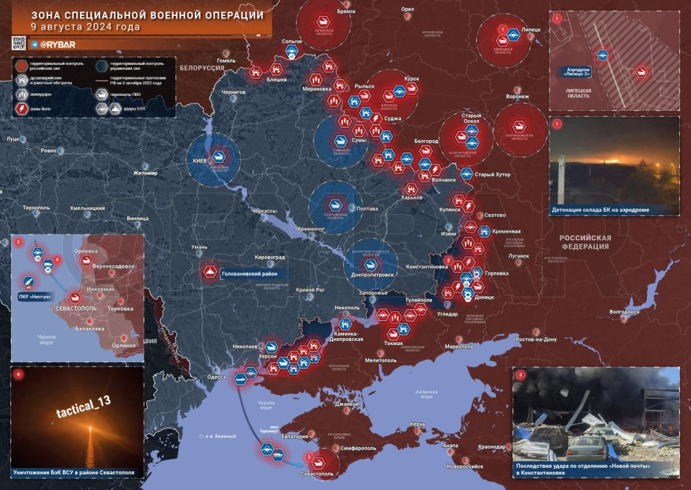 Хроника специальной военной операцииза 9 августа 2024 годаВ течение суток российские войска атаковали дронами объекты противника в Киевской, Днепропетровской, Полтавской и Кировоградской областях