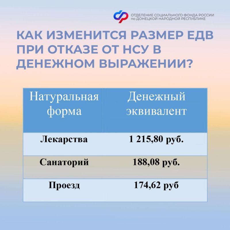Важно! Если вы хотите изменить вид НСУ (с денежного на натуральный или с натурального на денежный), то до 1 октября текущего года подайте заявление в клиентскую службу ОСФР по ДНР. Услуга начнет действовать с 1 января следующего года.