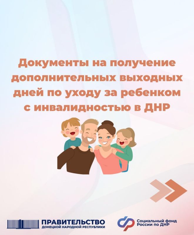 Какие документы необходимы для получения дополнительных выходных дней по уходу за ребенком с инвалидностью в ДНР?Подробности — в карточках