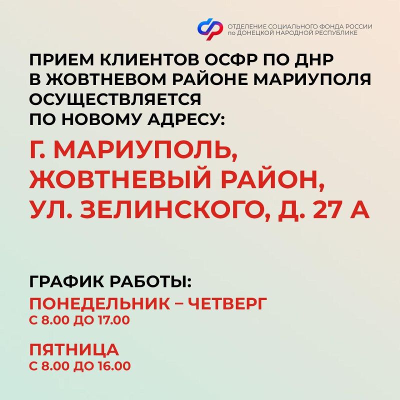 Отделение Социального фонда России по Донецкой Народной Республике сообщает, что клиентская служба в Жовтневом районе Мариуполя расположена теперь на новом месте.
