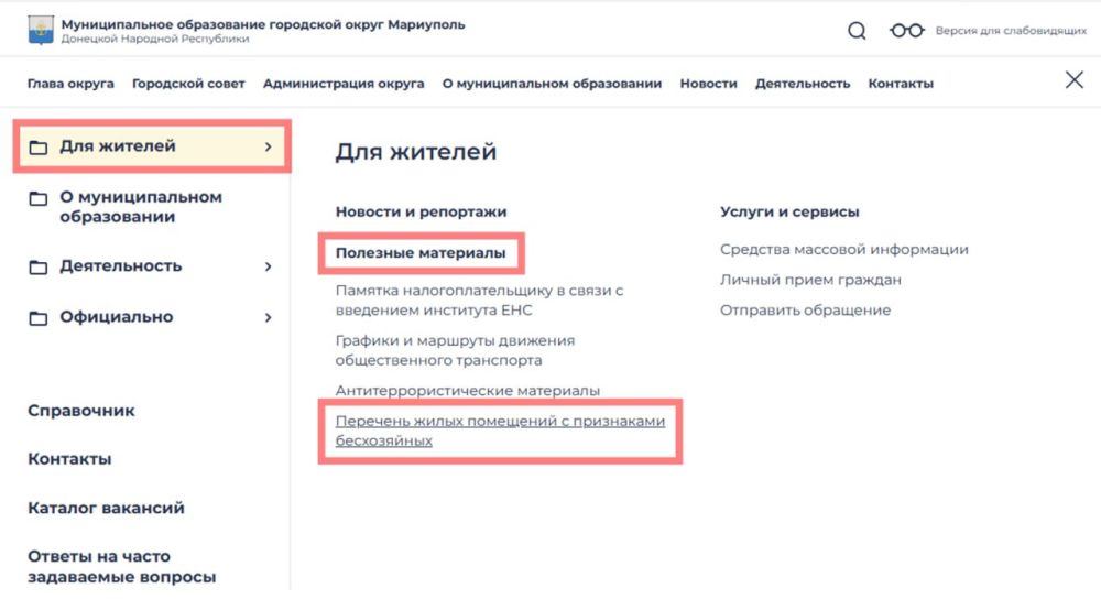 Для ознакомления со списком пользователям необходимо на сайте Администрации городского округа Мариуполь выбрать раздел «Меню», в нем выбрать подраздел «Для жителей», далее следует выбрать информационный материал под названием «Перечень жилых помещений с признаками бесхозяйных».