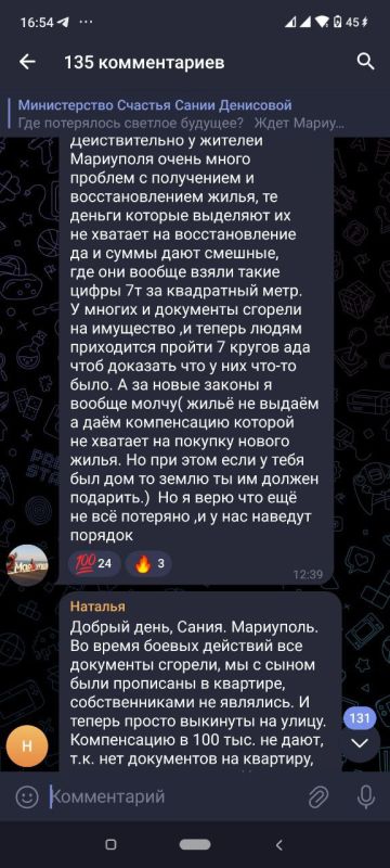 В числе основных проблем - возврат нормы о выдаче жилья, увеличение размера мер соцподдержки до уровня установленной приказом Минстроя стоимости квадратного метра по ДНР. На предлагаемые ныне 45 тыс.руб. за 1 кв.м. в Мариуполе невозможно ни купить жилье даже по соцнорме, ни построить, - жалуются горожане в чатах. Проблему можно решить, если внести изменения в соответствующую Госпрограмму для новых регионов России. Также у жителей есть вопросы к власти по процедуре включения домов и квартир в списки так называемого "бесхоза", по качеству ремонтов и обоснованности демонтажа домов, компенсации за утрату неприватизированного жилья и др.
