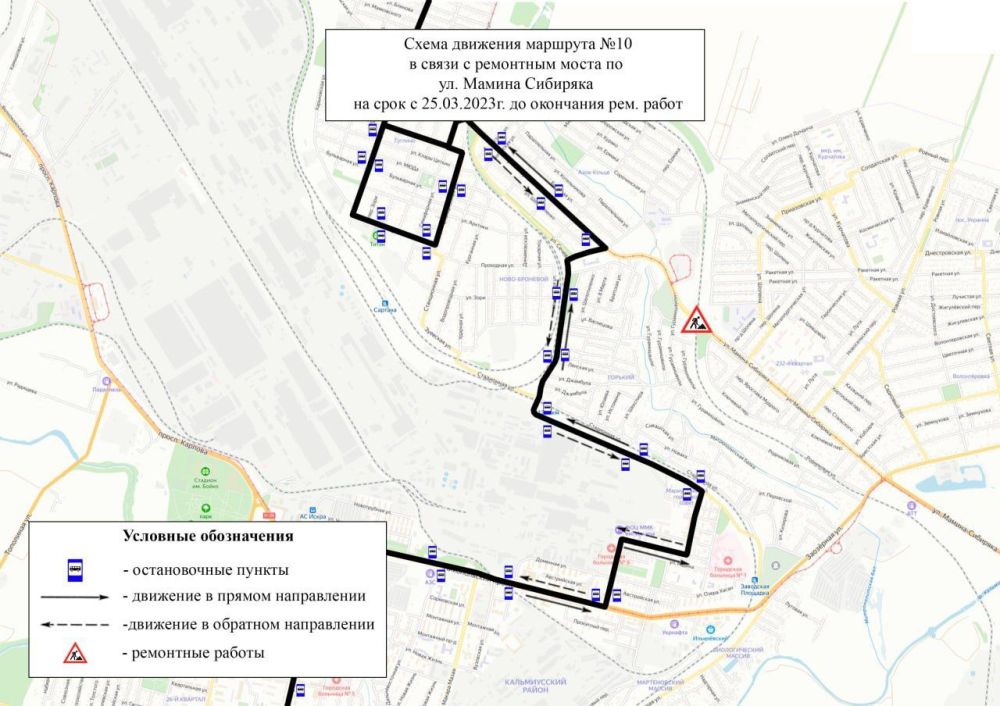 МУП АГМ «Мариупольтранс» информирует горожан, что с 25 марта на период ремонта моста по улице Мамина-Сибиряка между 232-м кварталом и Энергоучастком внутригородской автобусный маршрут №10 («ТЦ «Порт-сити – пос. Мирный») временно изменяет схему движения.