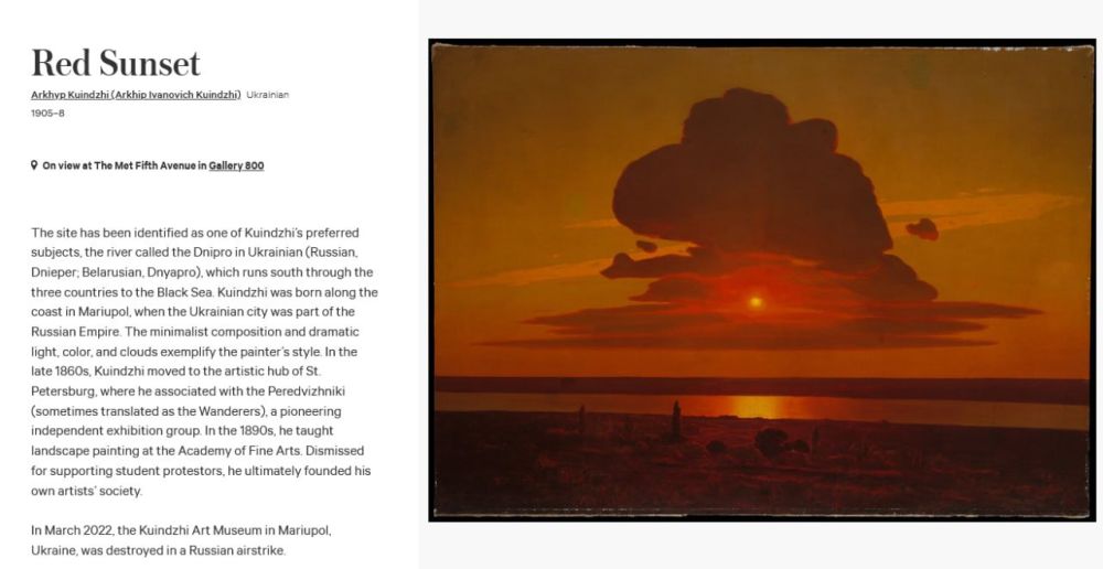 Изменения внесли в аннотацию к полотну Куинджи «Красный закат» — теперь напротив имени художника стоит пометка «украинский». Заодно в текст добавили новый абзац, в котором говорится, что музей Архипа Ивановича в его родном Мариуполе был разрушен весной прошлого года во время авиаудара.