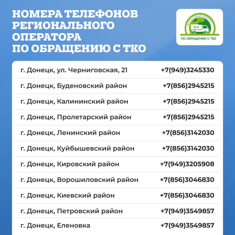 Минстрой ДНР сообщает номера филиалов регионального оператора «Донснабкомплект» Для вывоза твердых коммунальных отходов (ТКО) с территории населенных пунктов Республиканский единый региональный операт