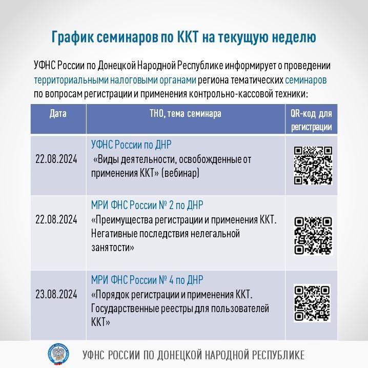 Налоговые органы ДНР продолжают цикл информационных мероприятий по вопросам применения ККТС графиком семинаров на текущую неделю можно ознакомиться в карточках