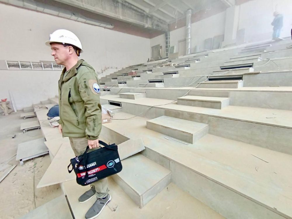 Специалисты лаборатории неразрушающего контроля ФАУ «РосКапСтрой» проводят визуально-измерительный контроль металлокаркаса при строительстве «наклонной» аудитории в одном из отремонтированных корпусов ПГТУ.