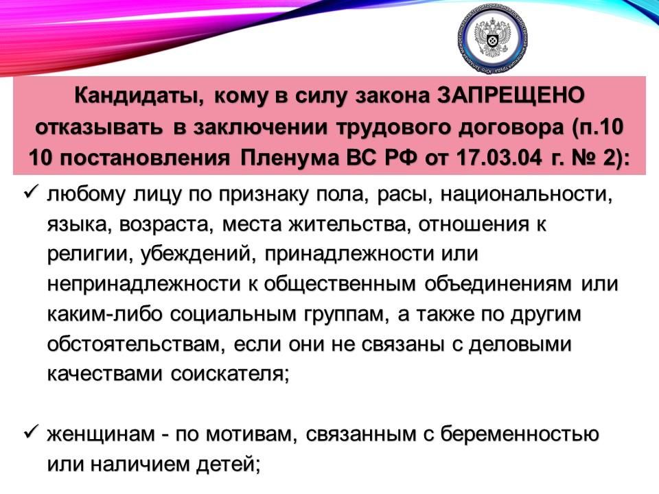 Таким образом, работодатель может отказать конкретному лицу в приеме на работу при наличии достаточных оснований и при условии, что кандидат не относится к числу тех, кому в силу закона в принципе запрещено отказывать в заключении трудового договора (п. 10 постановления Пленума ВС РФ от 17.03.04 г. №2).