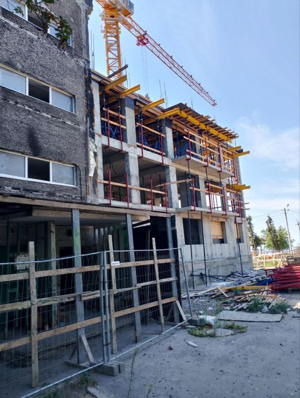 Строители осуществляют восстановление первого подъезда от уровня фундамента, в остальной части здания выполняется ремонт кровли, окон, дверей, центрального отопления и водоснабжения. В данный момент готовность объекта составляет 65%.