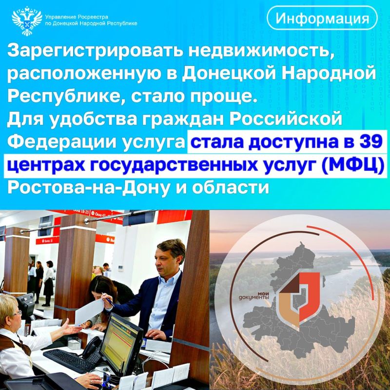 Зарегистрировать недвижимость, расположенную в Донецкой Народной Республике, стало проще. Для удобства граждан Российской Федерации услуга стала доступна в 39 центрах государственных услуг (МФЦ) Ростова-на-Дону и области.