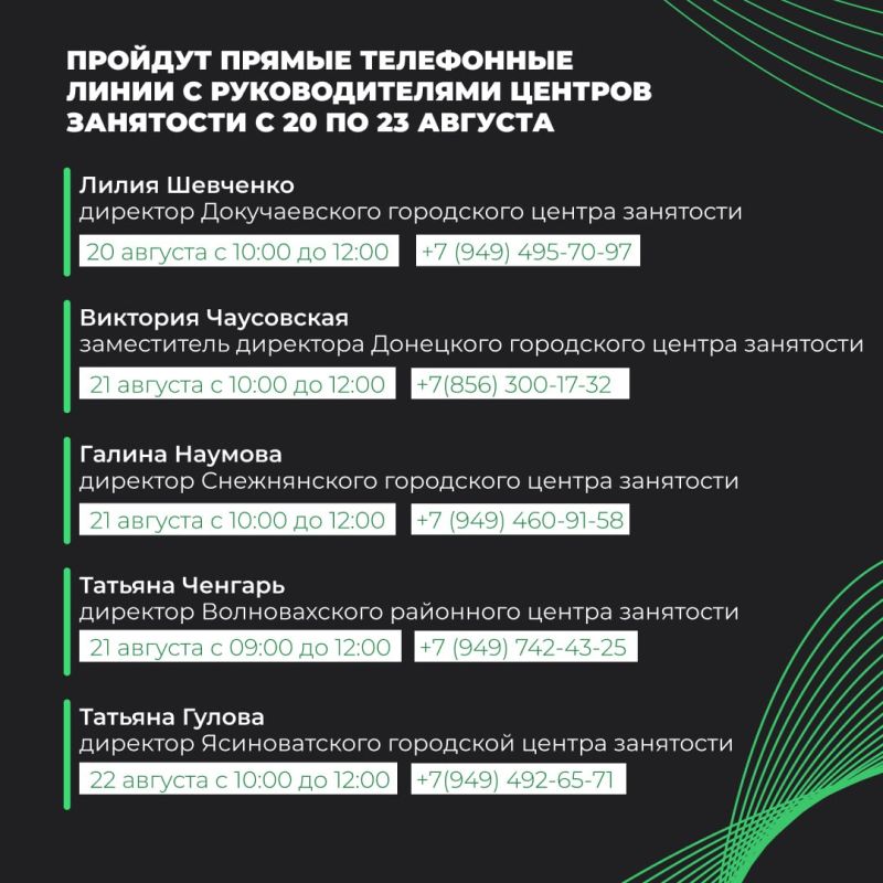 Республиканский центр занятости информирует о проведении прямых телефонных линий руководителями с 20 по 23 августаПодробнее — в карточках