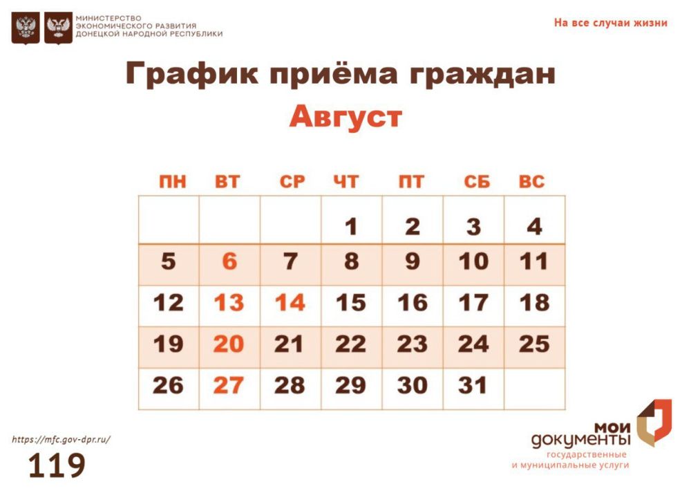 Сообщаем о датах приема граждан руководством ГБУ "МФЦ ДНР" в августе 2024 года