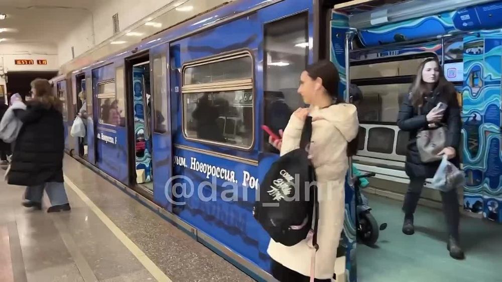 Так выглядит состав "Крым Новороссия Россия" на синей ветке метро МосквыВ вагонах - исторические иллюстрации Донецка, информация о его основателе - бизнесмене-промышленнике Джоне Юзе, в чест