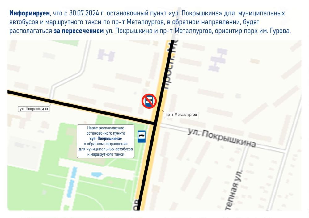 Информируем, что с 30.07.2024 г. остановочный пункт «ул. Покрышкина» для муниципальных автобусов и маршрутного такси по пр-т Металлургов, в обратном направлении движения маршрутов, будет располагаться за пересечением ул. Покрышкина и пр-т Металлургов, ориентир парк им. Гурова.