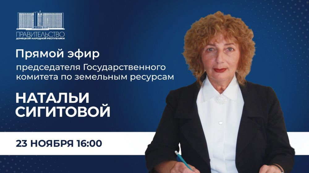 Уважаемые жители Республики!В четверг, 23 ноября, в 16:00 состоится Прямая линия председателя Государственного комитета по земельным ресурсам Донецкой Народной Республики Натальи Сигитовой