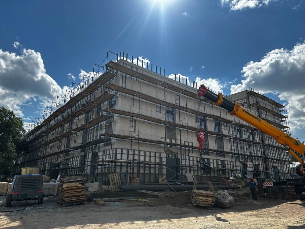 В Мариуполе продолжают отстраивать Корпус вспомогательных служб в больничном городке Строители из Петербурга выполняют устройство фасада, кровельные работы, монтаж дверей, занимаются кладкой перегород