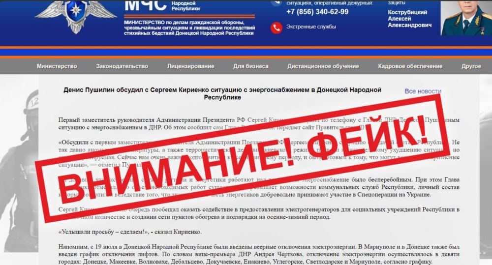 В социальных сетях распространяется недостоверная информация о якобы напряженной ситуации с энергоснабжением Донецкой Народной Республики. В частности, публикуется скрин-шот якобы с официального сайта МЧС ДНР с прилагаемой ссылкой.