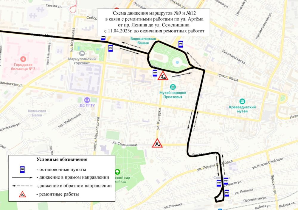 В связи с ремонтными работами по улице Артема корректируется схема движения маршрутов №9 и 12МУП АГМ «Мариупольтранс» доводит до сведения горожан, что с 11 апреля начинается ремонт дорожного полотна п