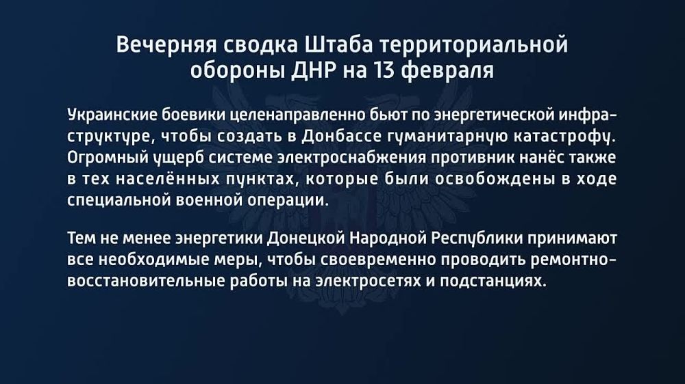 Вечерняя сводка Штаба территориальной обороны ДНР на 13 февраля 2023 года