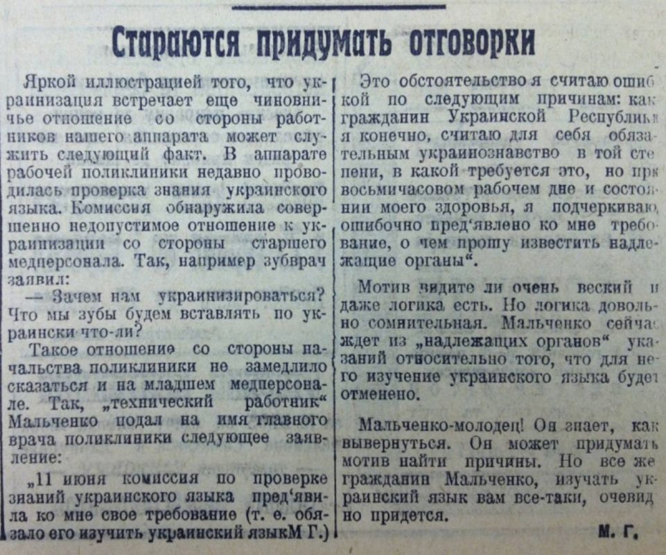 Но больше всего возмущения вызвал технический работник поликлиники Мальченко, который просил его освободить от украинизации по причине того, что он 8 часов работает и при этом имеет слабое здоровье. На что газета пишет: «Мальченко - молодец! Он знает, как вывернуться… Но все же, гражданин Мальченко, изучать украинский язык вам все-таки очевидно придется».