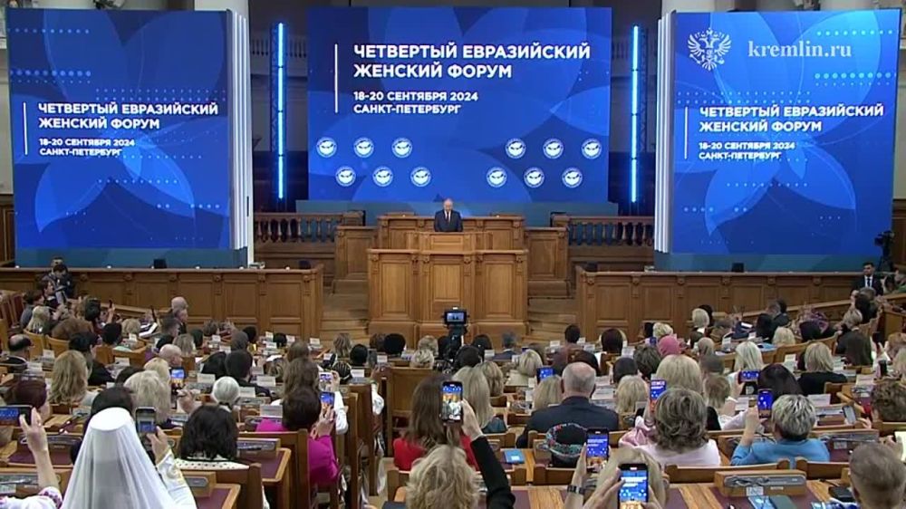 Владимир Путин выступает на пленарном заседании четвёртого Евразийского женского форума в Таврическом дворце в Санкт-Пет