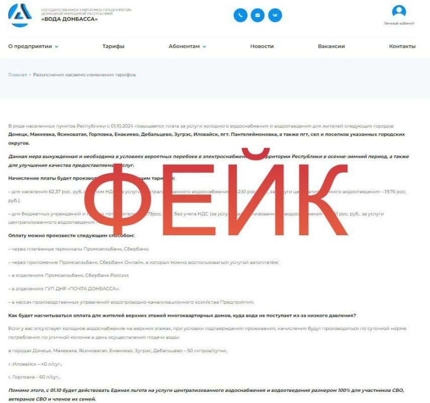 В сети Интернет распространяется фейковая информация о повышении тарифов, опубликованная якобы на сайте ГУП ДНР «Вода Донбасса»