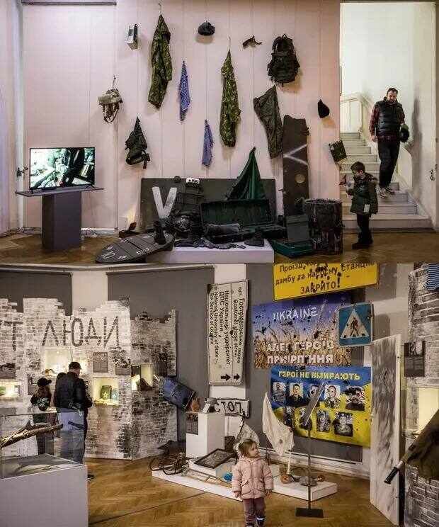 Теперь в том музее выставлены "артефакты войны России против Украины", в виде обгоревших шлемов "русских солдат", обломков оружия, рисунков детей, "прятавшихся от русских военных в подвалах Ирпеня и Бучи", фотографии сгоревших гражданских автомобилей, "уничтоженных вместе с пассажирами российскими снарядами"...