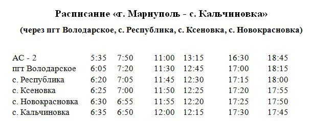 МУП АГМ «Мариупольтранс» с завтрашнего дня вводит новый регулярный маршрут, сообщением г. Мариуполь – с. Кальчиновка. По пути следования он будет проезжать через поселок Володарское и села Республика, Ксеновка и Новокрасновка.