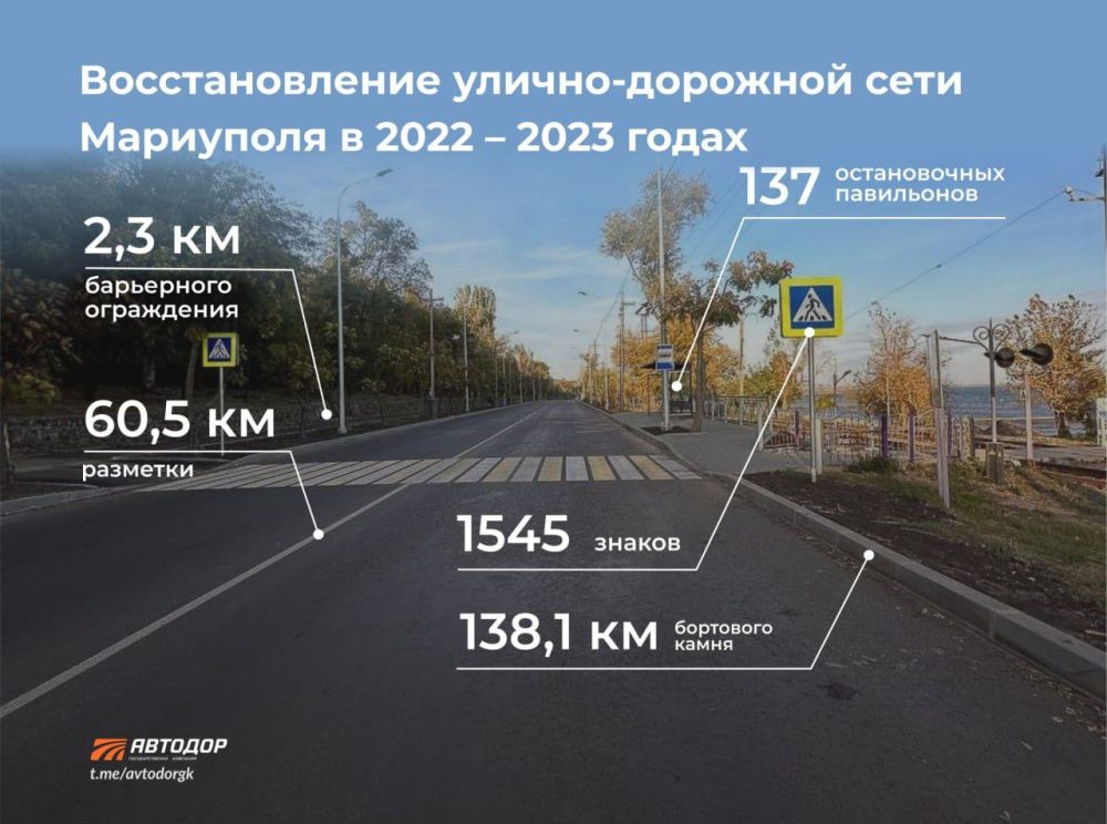 В прошлые годы Госкомпанией «Автодор» капитально отремонтировано более 70 км улично-дорожной сети Мариуполя. Благодаря восстановленным улицам, удалось снизить транспортную нагрузку на жилые районы и перепустить трафик по менее загруженным дорогам.