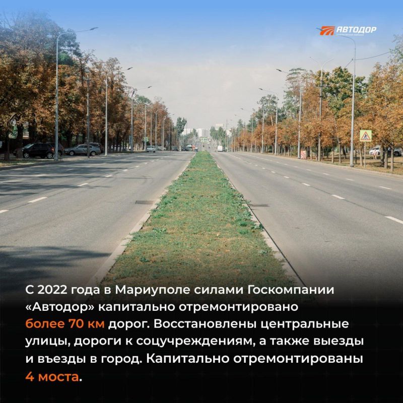 Госкомпания "Автодор" подготовила карточки о том, как проходит восстановление улично- дорожной сети МариуполяС 2022 года силами ГК «Автодор» капитально отремонтировано более 70 км улично-дор