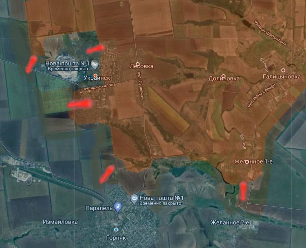Российские подразделения продолжают постепенно охватывать Украинск и террикон около города с севера и юга и они почти подошли к следующей линии обороны ВСУ, опирающейся на железную дорогу до Горняка».