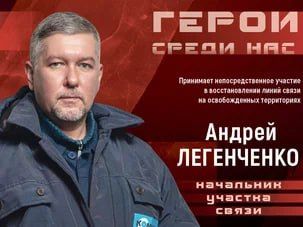 Легенченко Андрей Владимирович - начальник участка эксплуатации транспортной сети линейного цеха ГУП ДНР "Комтел". После освобождения города Мариуполь проводил восстановительные работы при участии саперов МЧС, в результате чего были организованы линии связи на города Мариуполь, Волноваху, пгт.Мангуш, Володарское, а также связь на особо-важные объекты. Руководил и принимал непосредственное участие в восстановлении линий связи: Дебальцево-Светлодарск, Светлодарск-Мироновское, Дебальцево-Артемовск, а также выполнял работы в городе Артемовск, для обеспечения связью подразделений Министерства обороны и МЧС ДНР. Принимает активное участие в реализации государственных программ РФ по строительству магистрального водовода, железной дороги и автомобильных трасс.