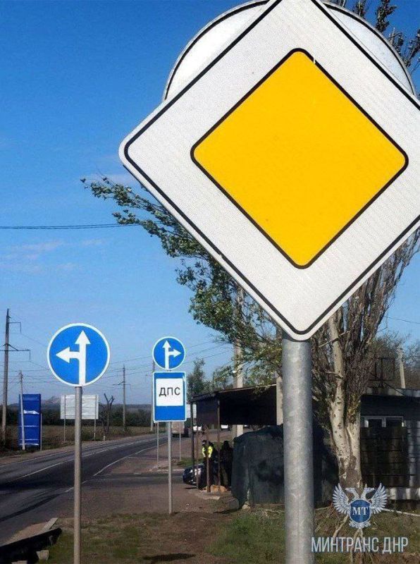 Под контролем «Службы автомобильных дорог Донбасса» продолжается установка дорожных знаков и нанесение разметки на дорогах общего пользования