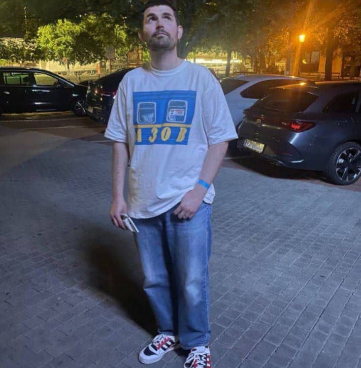 На фото, которым поделился Noize MC*, он стоит в футболке с изображением поезда Киев — Мариуполь, на котором была надпись «Азов».
